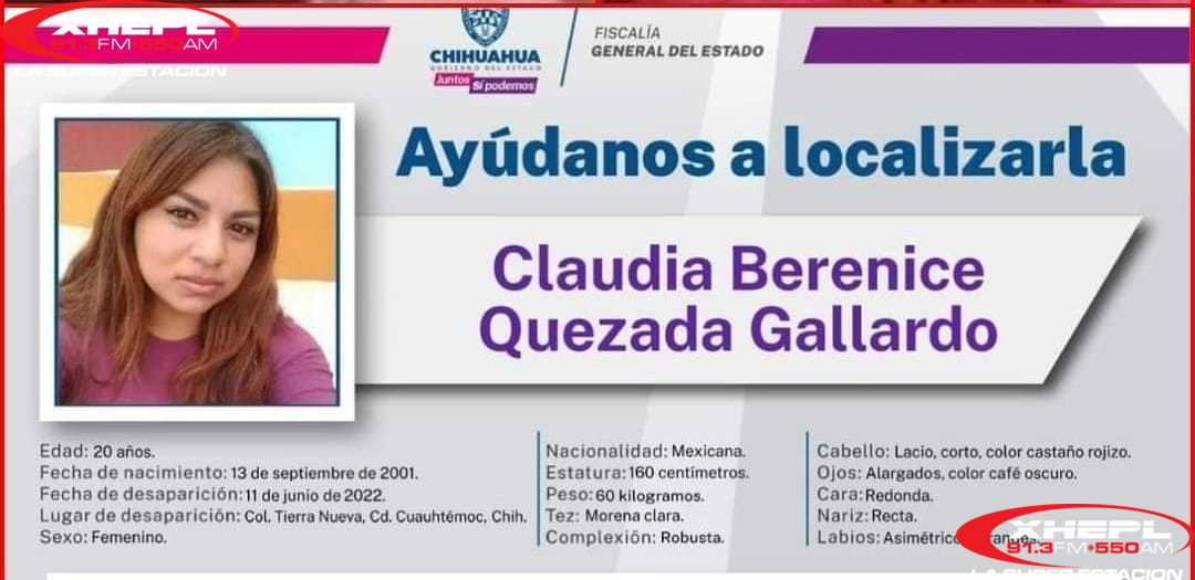 Claudia Berenice de 21 años de edad, contaba con reporte de desaparición en esta ciudad de Cuauhtémoc desde el pasado 11 de junio del 2021 en la colonia .