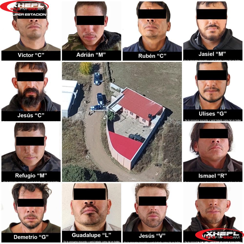 En dicho evento, se detuvo a Guadalupe “L”, Adrián “M”, Refugio “M”, Jesús “V”, Víctor “C”, Ulises “G”, Jesús “C”, Demetrio “G”, Rubén “C”, Ismael “R”, Ángel “E” y Jasiel “M”, asegurándoles 16 armas largas con su respectivo cargador y cartuchos, cinco armas cortas con su respectivo cargador y cartuchos; dos mil 214 cartuchos, 74 cargadores de diversos calibres, cuatro chalecos tácticos, una ametralladora y un lanzagranadas.