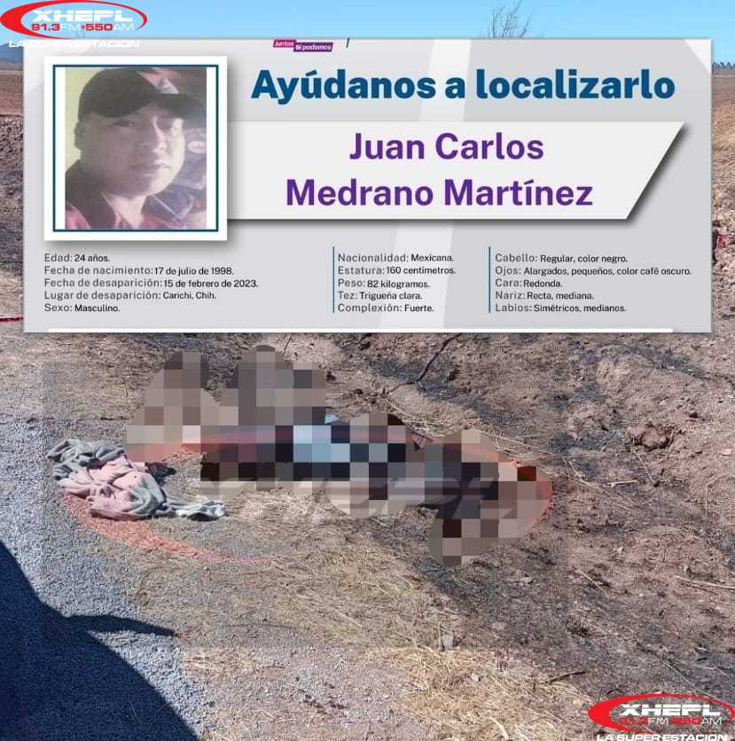 El cuerpo fue traslado a las instalaciones del Servicio Médico Forense (Semefo), en donde fue reconocido como Carlos Medrano Martínez, de 24 años de edad, con domicilio en Carichí, quien trabajaba como empleado de huerta.