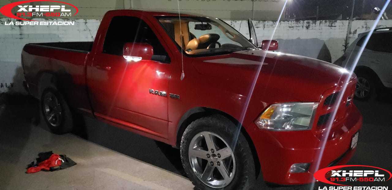 Al llegar al lugar, tuvieron a la vista un vehículo Dodge Ram, Hemi, color rojo cabina sencilla con placas de circulación EE 37369 en la cual se localizaron 10 casquillos percutidos de un arma calibre 9 milímetros.