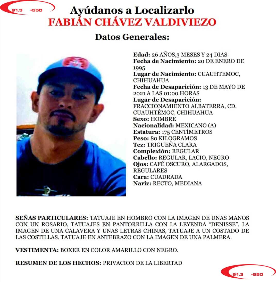 La fiscalía regional de la zona occidente, lanzó la tarde de hoy jueves la pesquisa para localizar a Fabián Chávez Valdiviezo de 26 años de edad, quien fue privado de su libertad durante la madrugada de hoy, del fraccionamiento Albaterra.