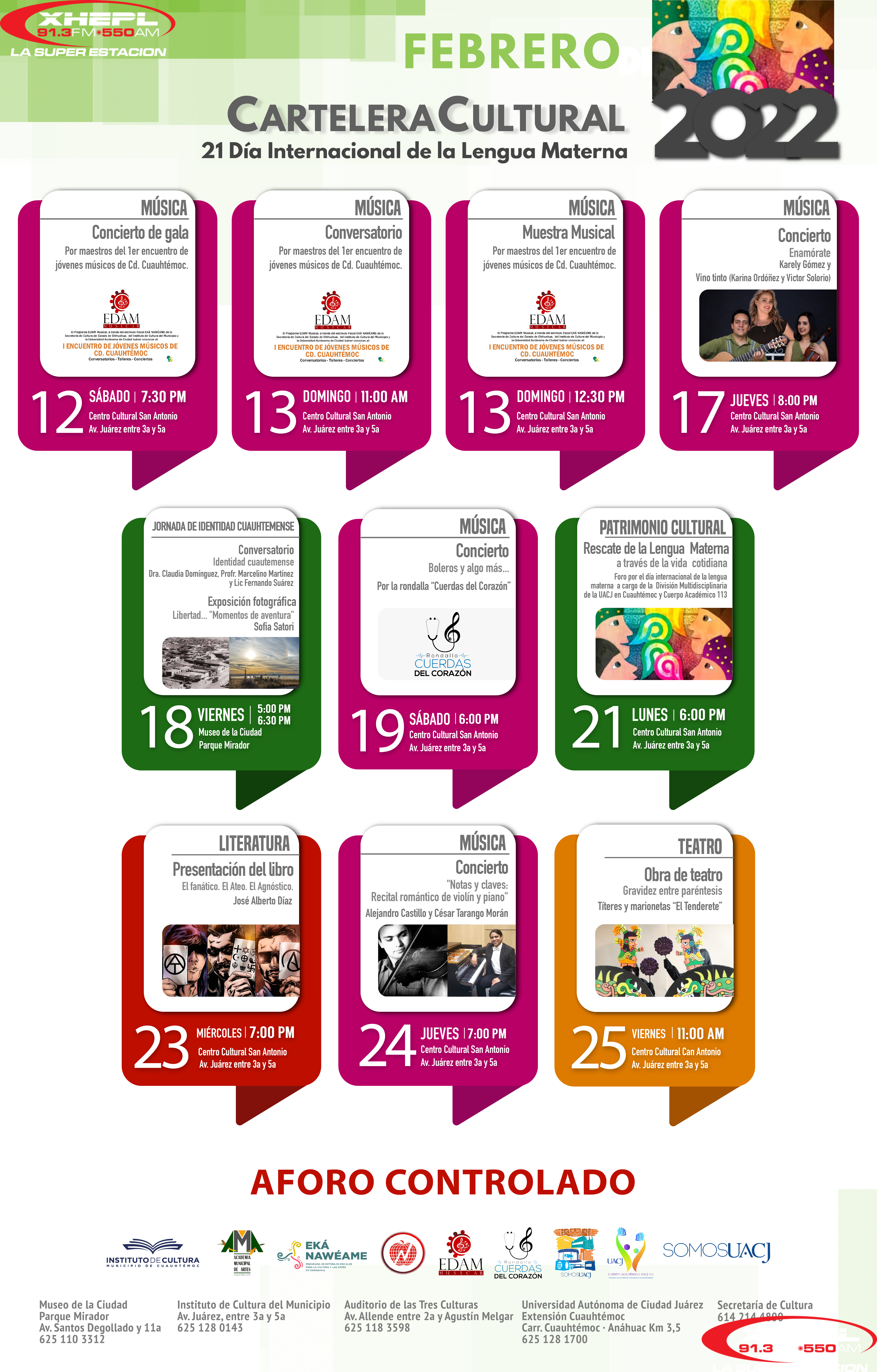 El director del Instituto Municipal de Cultura, Raúl Manríquez, dio a conocer la Cartelera Cultural de Febrero, la cual contempla eventos desde el próximo sábado 12 hasta el día 25 del mes.
